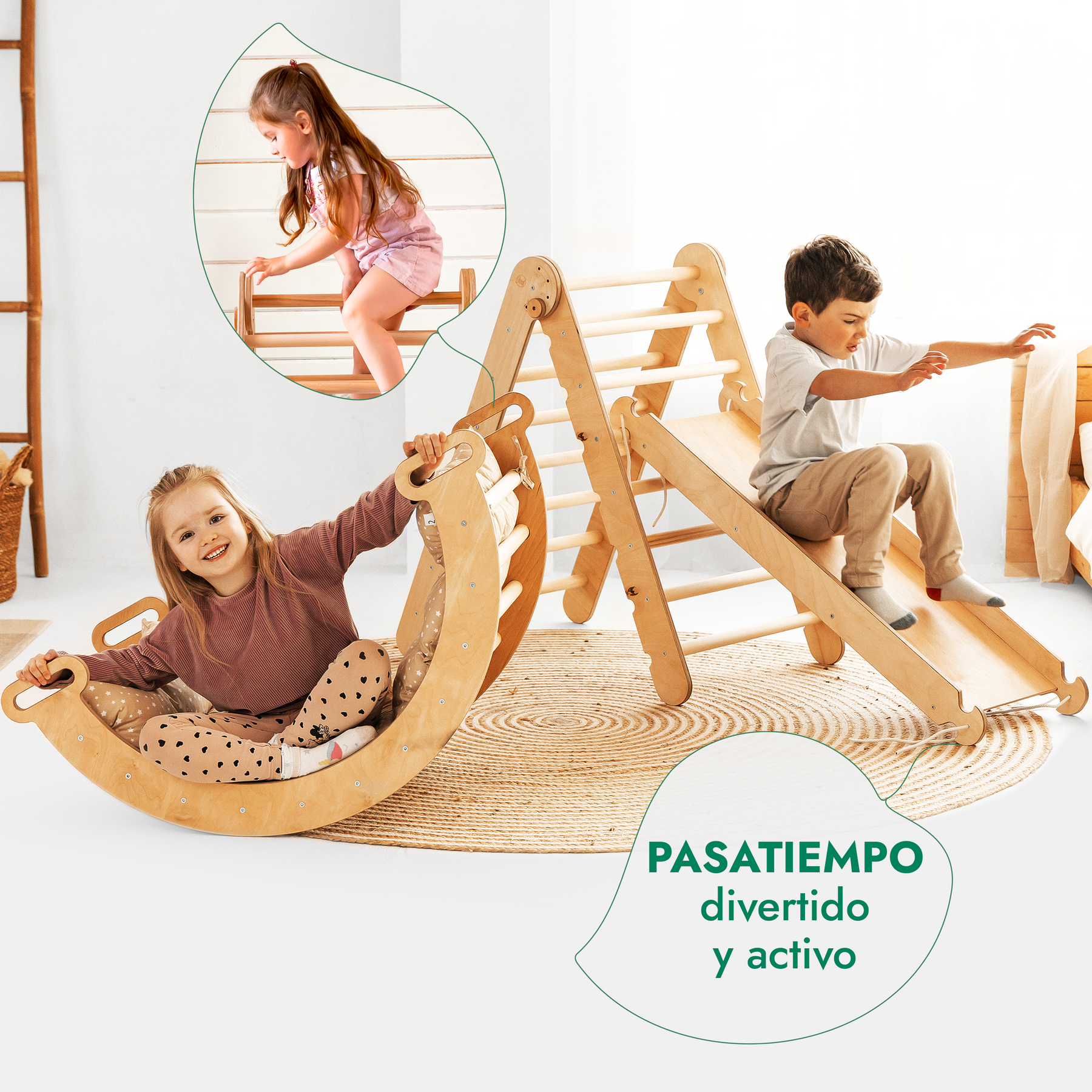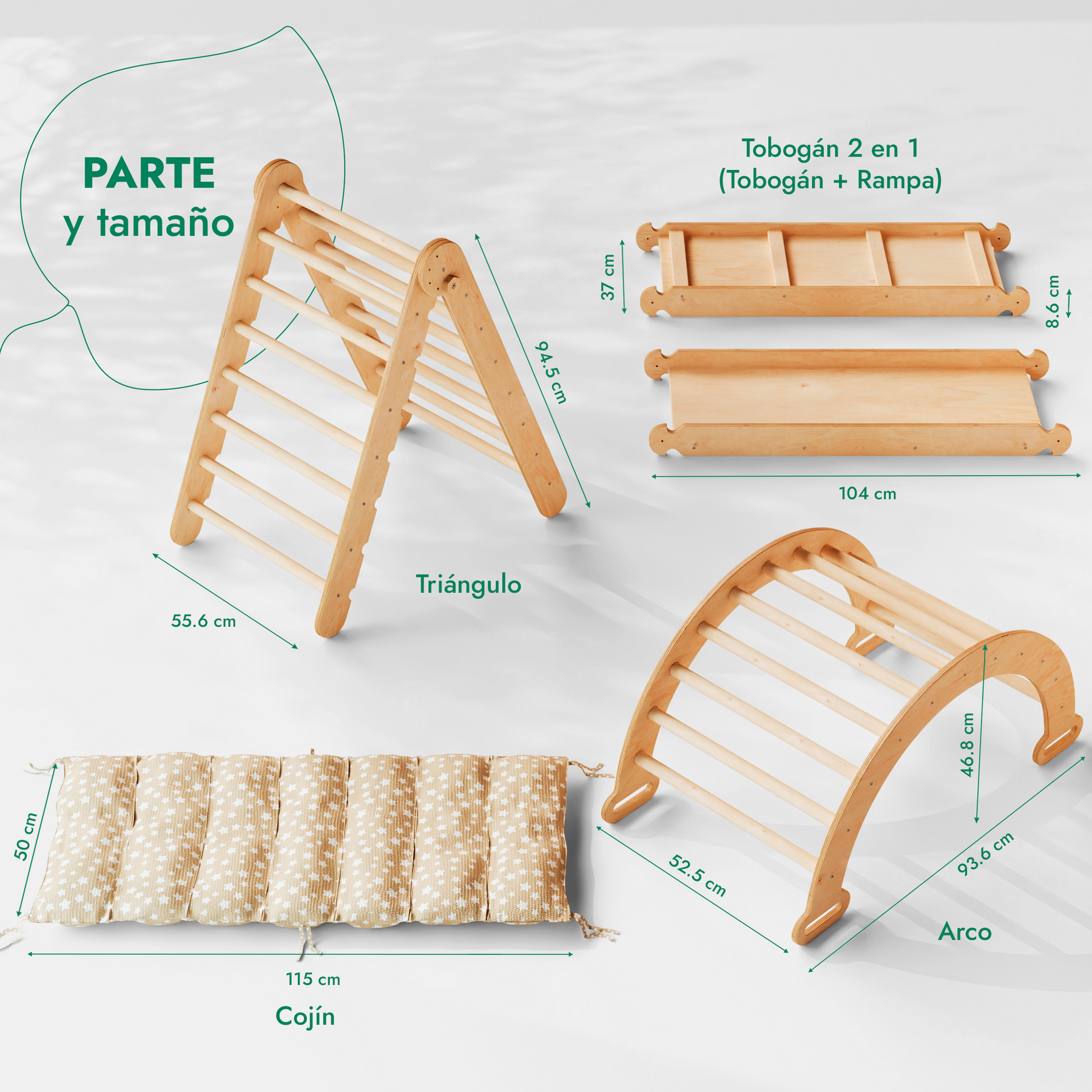 Este conjunto para trepar Montessori 4en1 es un éxito de ventas en Goodevas. Todos los artículos de este conjunto están creados siguiendo el método Montessori, que promueve el crecimiento automotivado de los niños en todas las áreas: desarrollo cognitivo, estabilidad/crecimiento emocional y bienestar físico. Es una forma ideal de ayudar a su hijo a desarrollar los músculos, el control del equilibrio, la coordinación mano-ojo, las habilidades motoras y la confianza en sí mismo. Los principales elementos del conjunto son:
