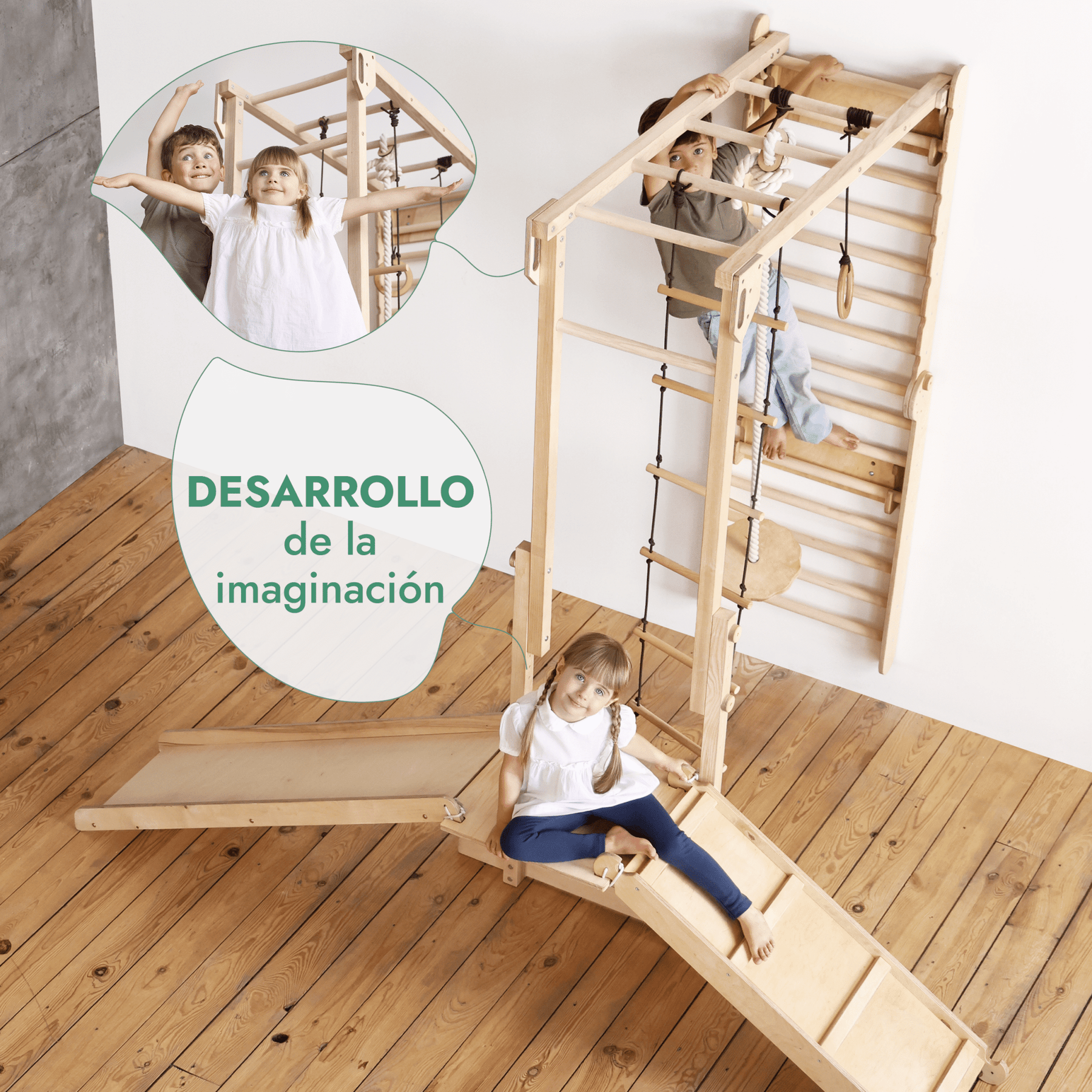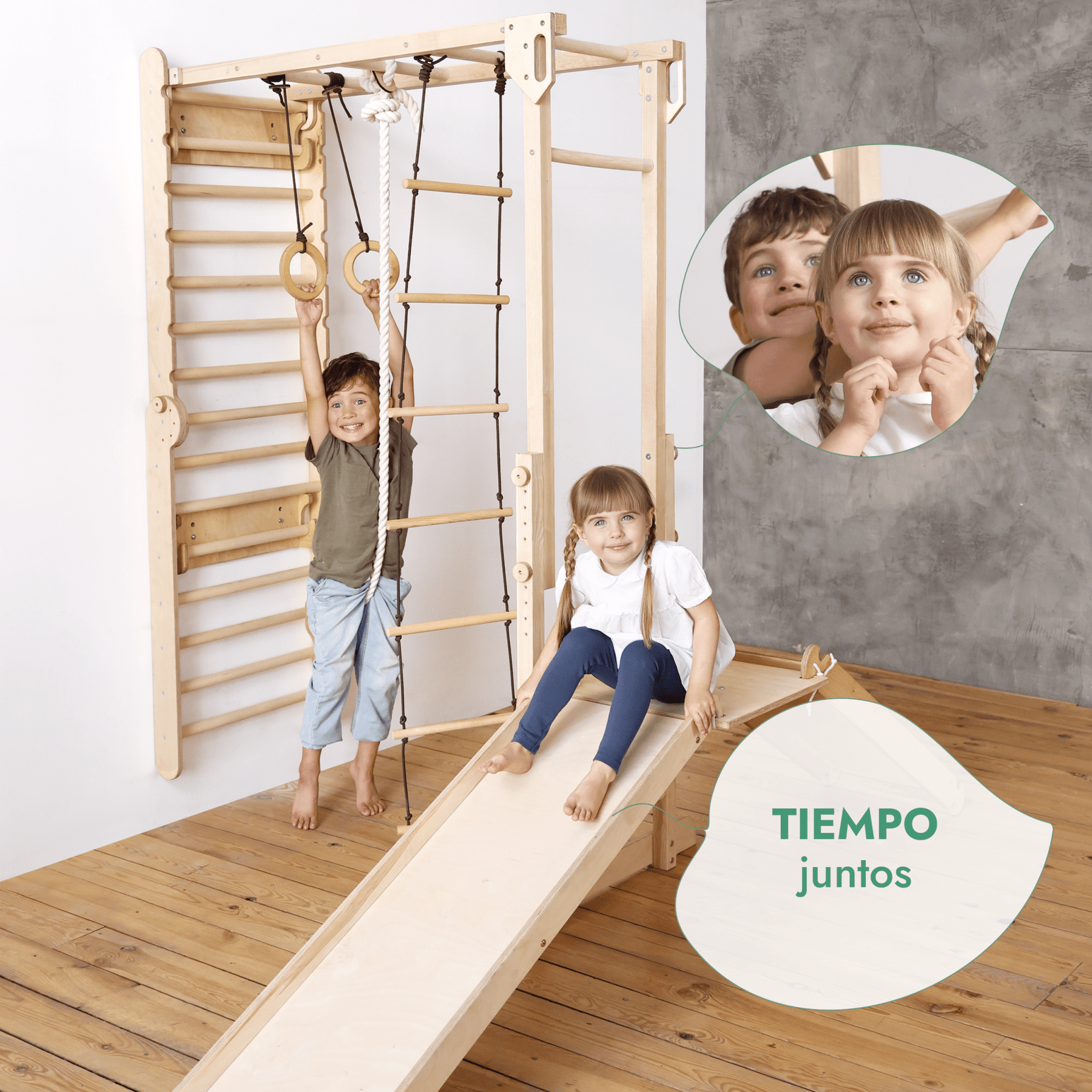 Multifuncional — un solo kit adicional transforma la pared en un área de juego completa: escalada, columpios, dominadas y ejercicios de gimnasia.