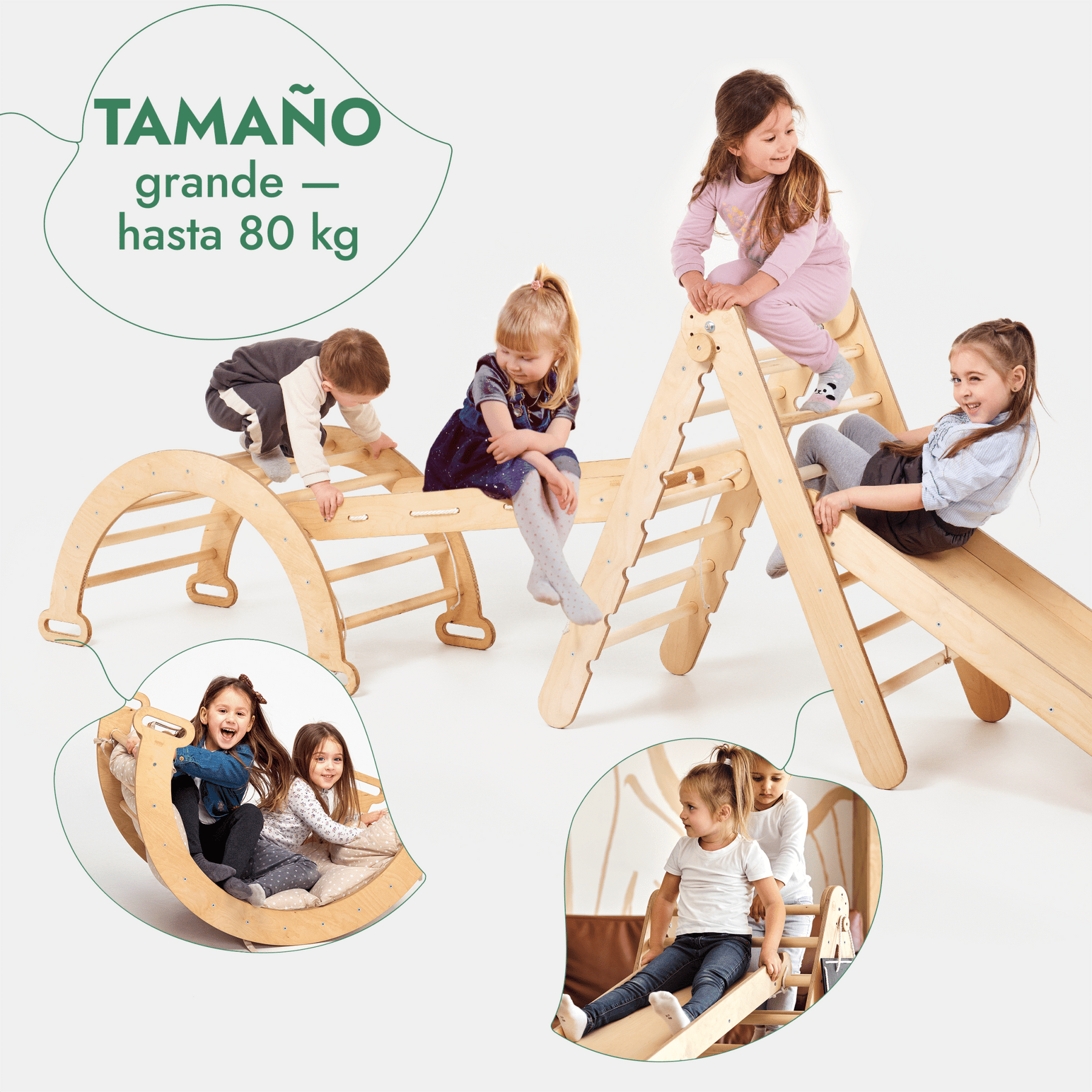 Brinda a tus hijos la oportunidad de desarrollar su equilibrio, coordinación y habilidades motoras de una forma divertida y estimulante. Nuestro set de escalada Montessori incluye los elementos esenciales: un arco oscilante, una escalera triangular, un tobogán/escalones de doble cara y muchos accesorios adicionales. Este versátil set convierte el juego activo en una poderosa herramienta de desarrollo.